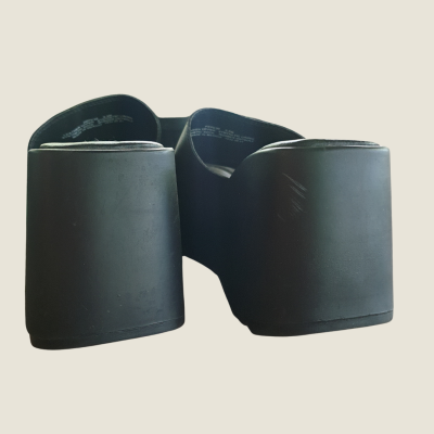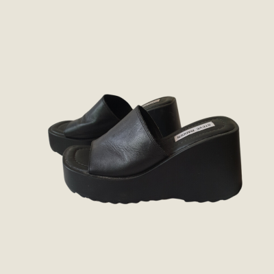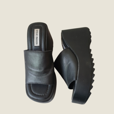 Black leather slip-on platform sandals with a cushioned footbed and chunky, ridged sole for added height and comfort. Size US 6.5 / UK 4.5. Minor scuff present but in good condition.
